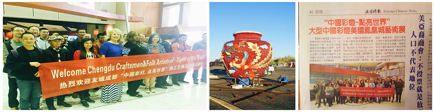 (菲尼克斯當地華僑及美國友人歡迎燈貿集團工作人員的到來)         (彩燈燈組現場安裝工作正在進行)        (當地媒體對本次燈展進行相關報道)