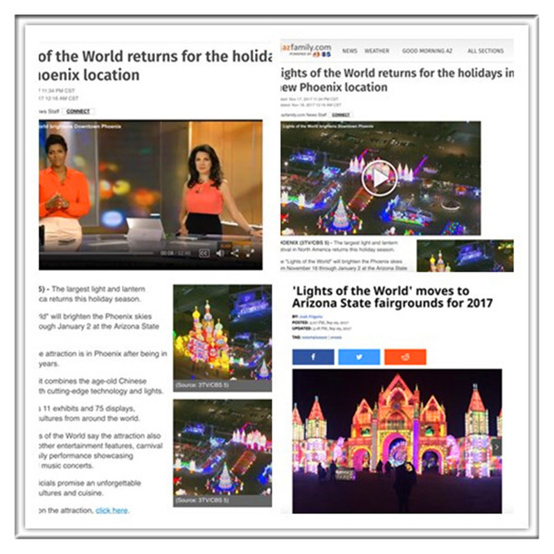 開幕式上菲尼克斯印第安原住民、拉丁裔、華人、墨西哥等各族裔文化藝術團體表演了豐富多彩的歌舞節目,展示了菲尼克斯多元文化風采。瑰麗的花燈、燦爛的民間藝術和強大的演出陣容,園內數千名美國觀眾無不歡呼雀躍、拍手稱奇。美國亞利桑那州各大主流媒體、華人媒體全面采訪報導了燈會開幕式盛況。菲尼克斯當地新聞《 Now @ 6 》報道稱“2017世界之光彩燈嘉年華是北美最大的彩燈節,是全球文化集合地,游客仿佛置身于迪士尼中。”