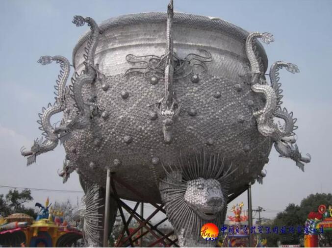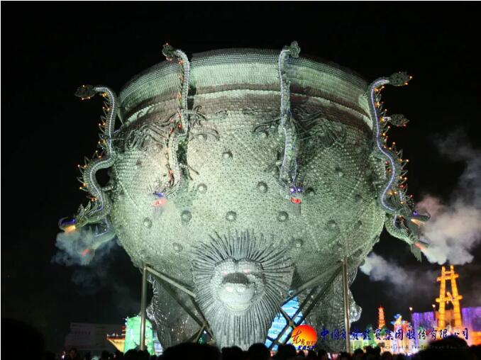 東方彩燈精心設計制作的“九龍鼎”燈組采用景德鎮青花玲瓏瓷具杯、羹、匙、盅、盤、碟、碗等近30萬件手工捆扎而成,主體為鋼結構;鼎高和直徑均為18米,最大處直徑26米,總重近100噸。