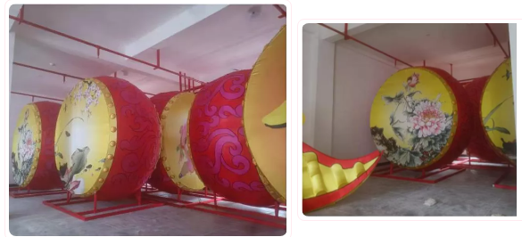 現場大多數的花燈還在按流程趕制中,也有一些已成型了。已經制作好的打鼓你能看出是哪一個花燈造型的嗎?