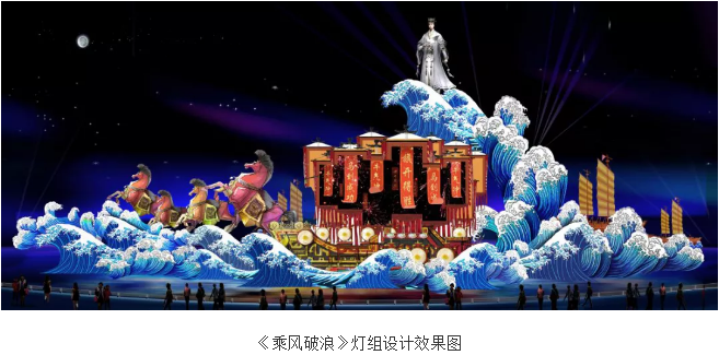 西區湖面上,長65米,高22米的主題燈組“乘風破浪”是本屆廟會中的“巨無霸”,利用現代燈光技術以獨特的藝術手法展現了三國時期的著名戰役——赤壁之戰。一幕精彩的三國故事圖卷將在波光粼粼的湖面上徐徐鋪展。
