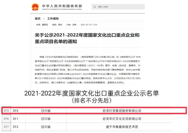 近日,商務部、中宣部、財政部、文化和旅游部、國家廣電總局五部委聯合公示《2021—2022年度國家文化出口重點企業和重點項目名單》,自貢燈貿集團股份有限公司再次入錄“2021-2022年度國家文化出口重點企業”公示名目。這是自貢燈貿集團股份有限公司自2007年以來,連續第八次榮獲此殊榮,也是全國彩燈行業唯一連續八屆十六年獲此殊榮的服貿類企業。
